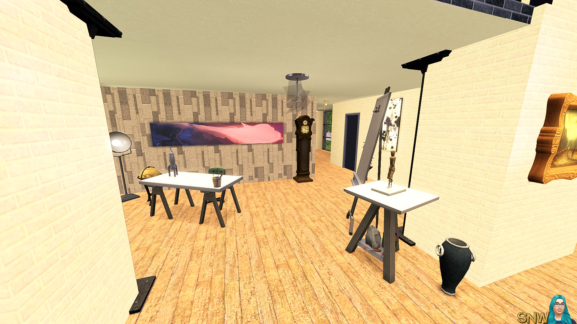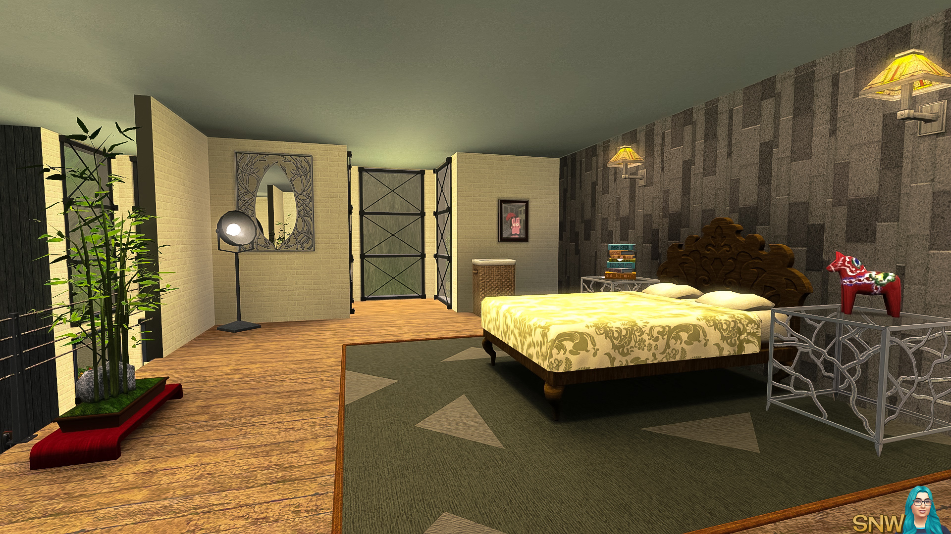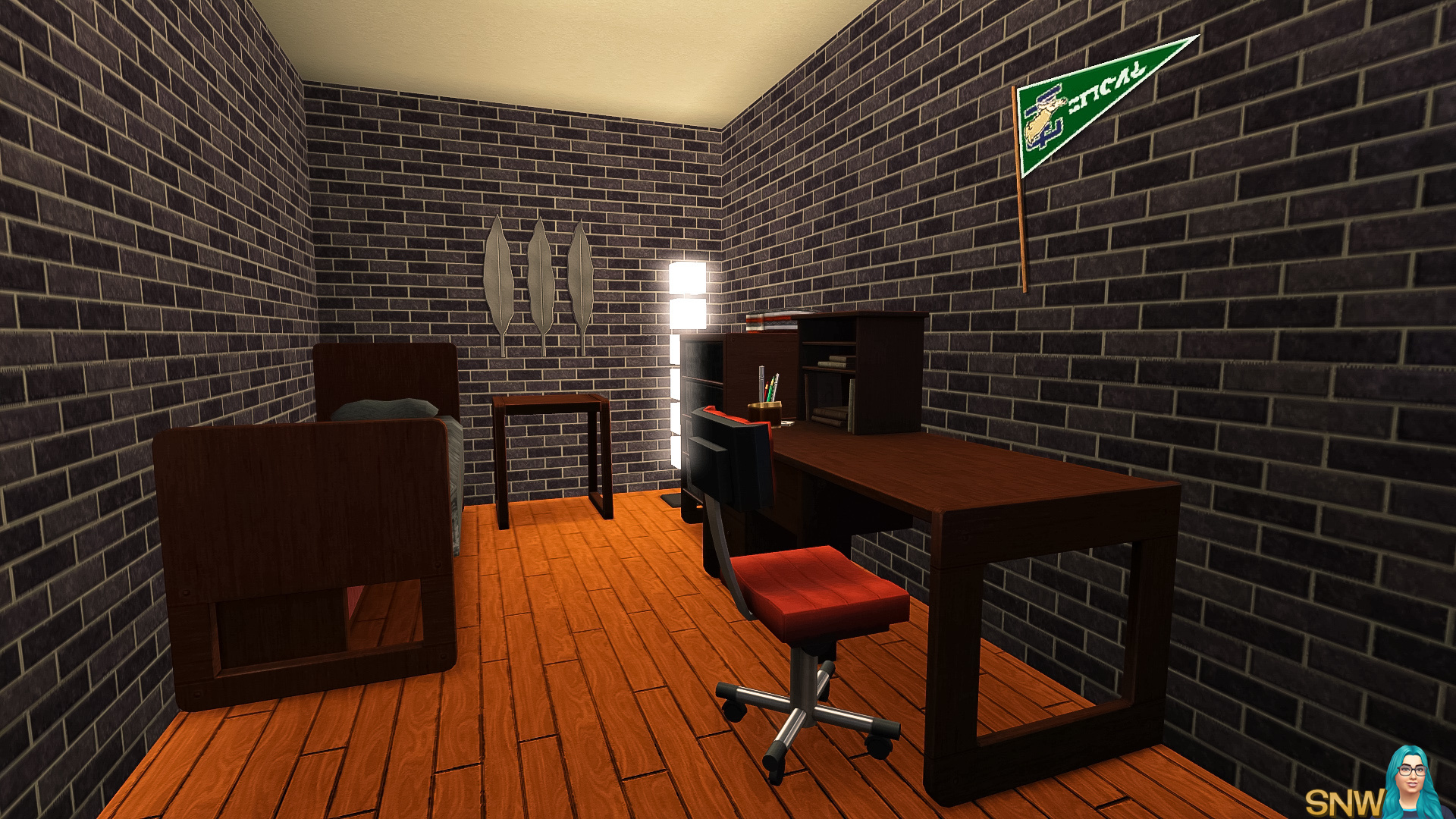 This loft has the most hipster furniture of them all. It has stairs leading to the bedroom and separate bathroom. Again all the basics are here. There is another room with has a single bed, desk and dresser. In theory you could place 3 Sims in this loft, but it might be too small. I'd have two Sims live here at most.