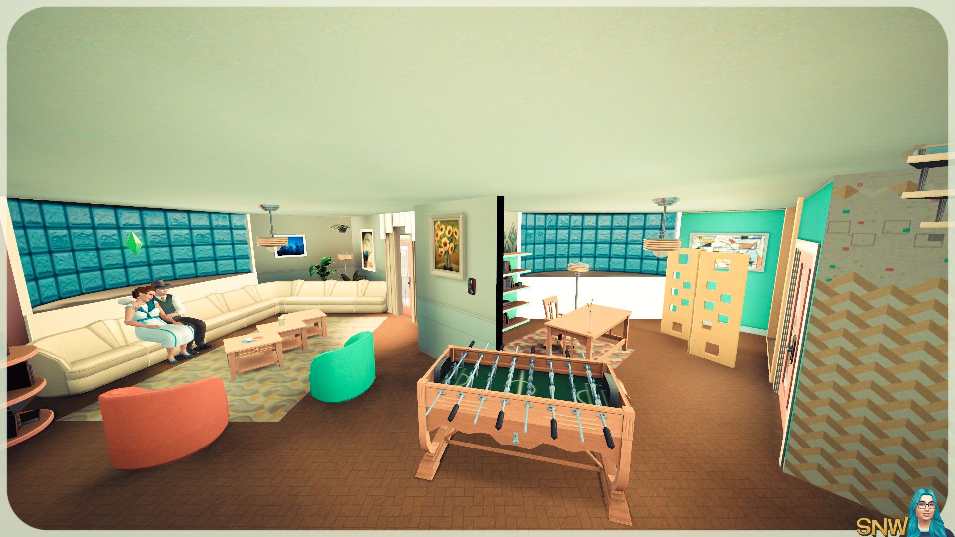 Upstairs you'll find a small bathroom, one master bedroom, one large single Sim bedroom (for kids or teens), and finally a nursery. There's pink wallpaper now, but you can easily change that into something else if you don't like the pink! The hallway and the nursery both have access to balconies!