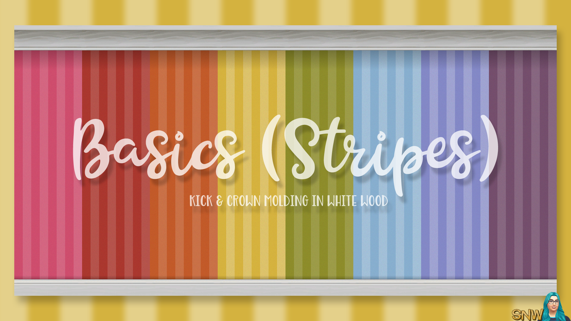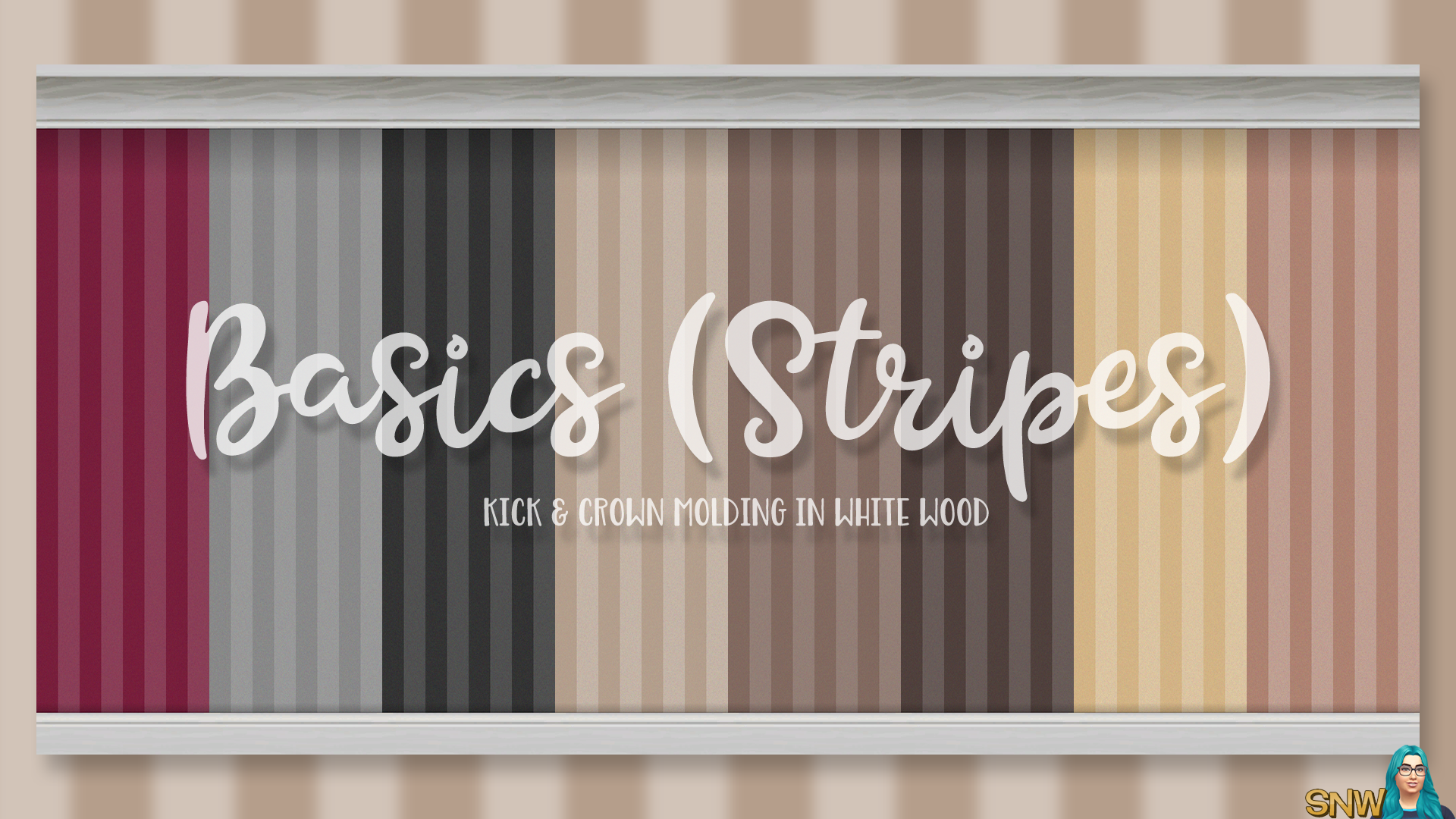 This wall is part of the Basics Wallpapers set. It's the Striped set. The walls have kick and crown moulding in white wood. There are 32 colour options to choose from.