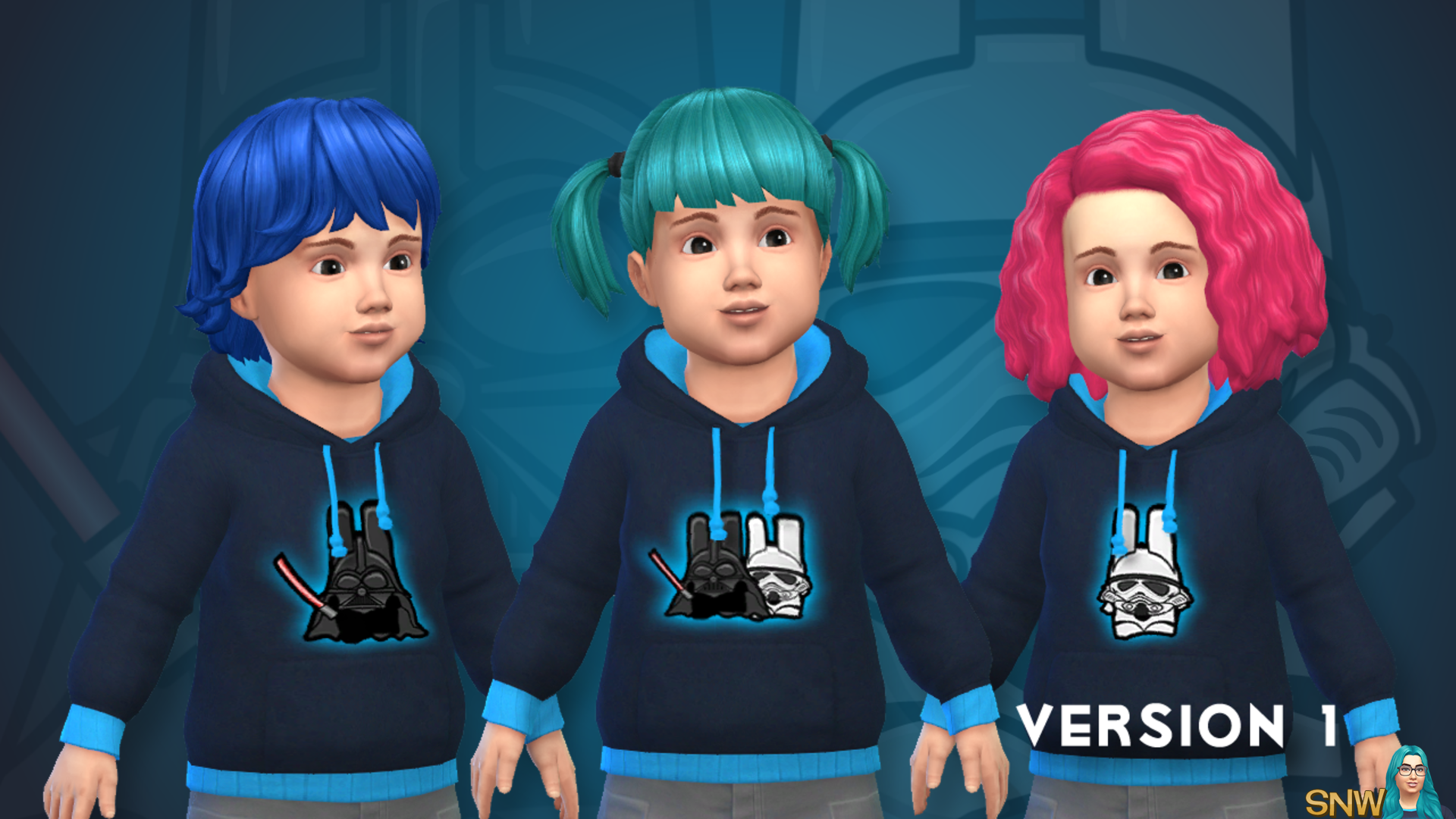 We finally have toddlers! Much excite! (L) Of course I couldn't resist creating custom content for the wee ones. So I present to you, the first toddler custom content for The Sims 4 on SNW... Freezer Bunny Star Wars hoodies! I made this illustration about 2 years ago. And I've made a bunch of shirts already for adults and kids. But now toddlers can wear cute, nerdy outfits too!