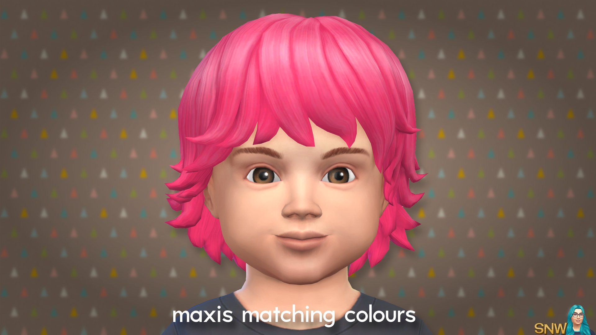 You know how teens, (young) adults and elders have 18 colour options for each hairdo? Well, kids and toddlers do not have all these colours. Kids and toddlers have 9 colour options per hairdo. And while I get that grey(ing) hair is a bit odd on a child or toddler, I really love the bright, funky colours in the game. So I decided to create 5 funky colours per hairdo for the toddlers: