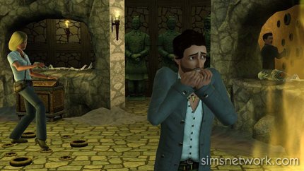 In many cases, in the easier tombs that ship with the game, rooms will be laid out in a way that encourages you to poke around. While we didn't find any mummies to leap out of sarcophagi and attack us (the physical body skills of your sims will help you get the upper hand, as will the new martial arts skills you can learn in the Chinese ruins area), we did find plenty of harmless-looking rooms with only a few apparent interactive objects--a trap here or there, a pressure plate, or a sliding statue. You can pull or push statues by lining up your cursor with the direction you want to push or pull, and leaving a statue on top of a pressure plate will keep that plate "triggered," which is a state you may need the plate in to solve the next part of the puzzle. Once we triggered the plates or pressed buttons, we'd find any number of other results--other hidden plates and triggers popping up, traps activating or deactivating, hidden treasures and keys popping up, and stairways going up or down to the next levels. Yes, ruins can have multiple floors and can be created to be absolutely huge. They can be so huge, in fact, that in order to ease your transit time from deep in the dungeon to back to the campsite, you may also find, if you're lucky (or put in yourself, if you use the editing tools), a diving pool your sims can use to instantaneously route back home.
