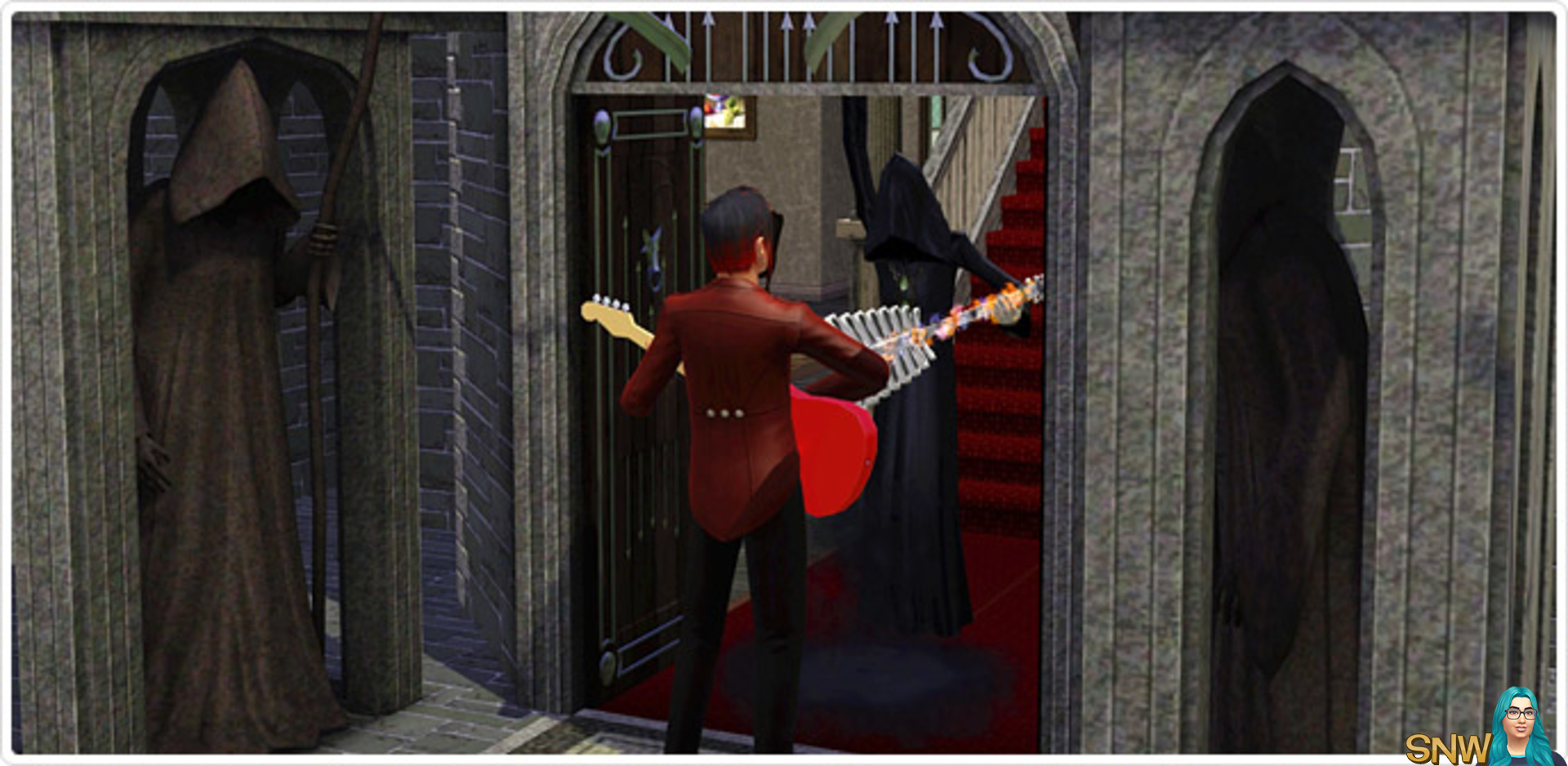 When most Sims hear that the Reaper is coming they want to run away, but the Door of Life and Death lets your Sim go right up and knock on his door. And you might just find that he’s not that bad after all! Want to bring a lost loved one back? Just knock at the Reaper’s door to have them reincarnated! Have a loner that wants to try parenting all on their own? Have old Grimmy Simulate a Genetic Merger with the Sim of your choosing! You can even challenge the Reaper to a high stakes guitar duel!