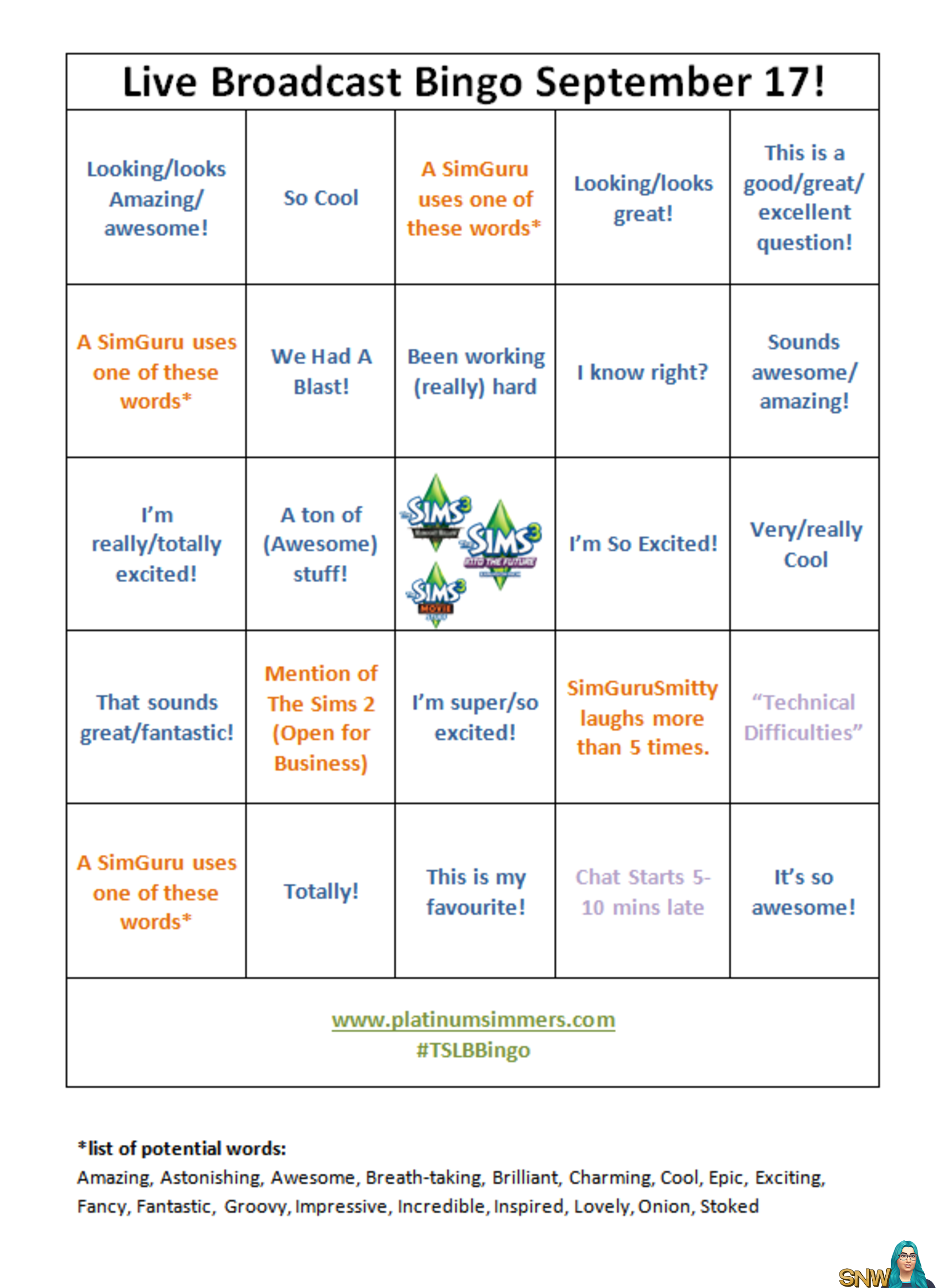 A new live broadcast, a new Bingo session, brought to you by Platinum Simmers! Go here to view/download the full version for today's broadcast!