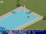 Backyard: After completing the interior of our new house, we headed outside to make a few cosmetic changes. The first thing we did was add a swimming pool complete with a deep-end ladder and a diving board, and we adorned either side of it with a dolphin topiary. To further spoil our Sims, we added a basketball hoop, a massive outdoor telescope, and a THX-451 barbecue grill at the other end of the backyard.