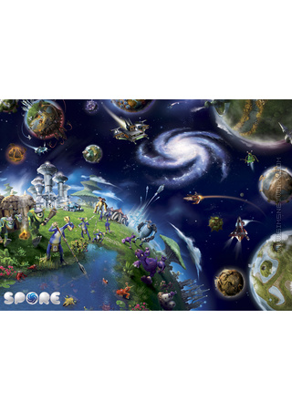 This beautifully designed art piece depicts a snapshot of the Spore universe and all of the differing stages, from cell, all the way up to star ship captain..