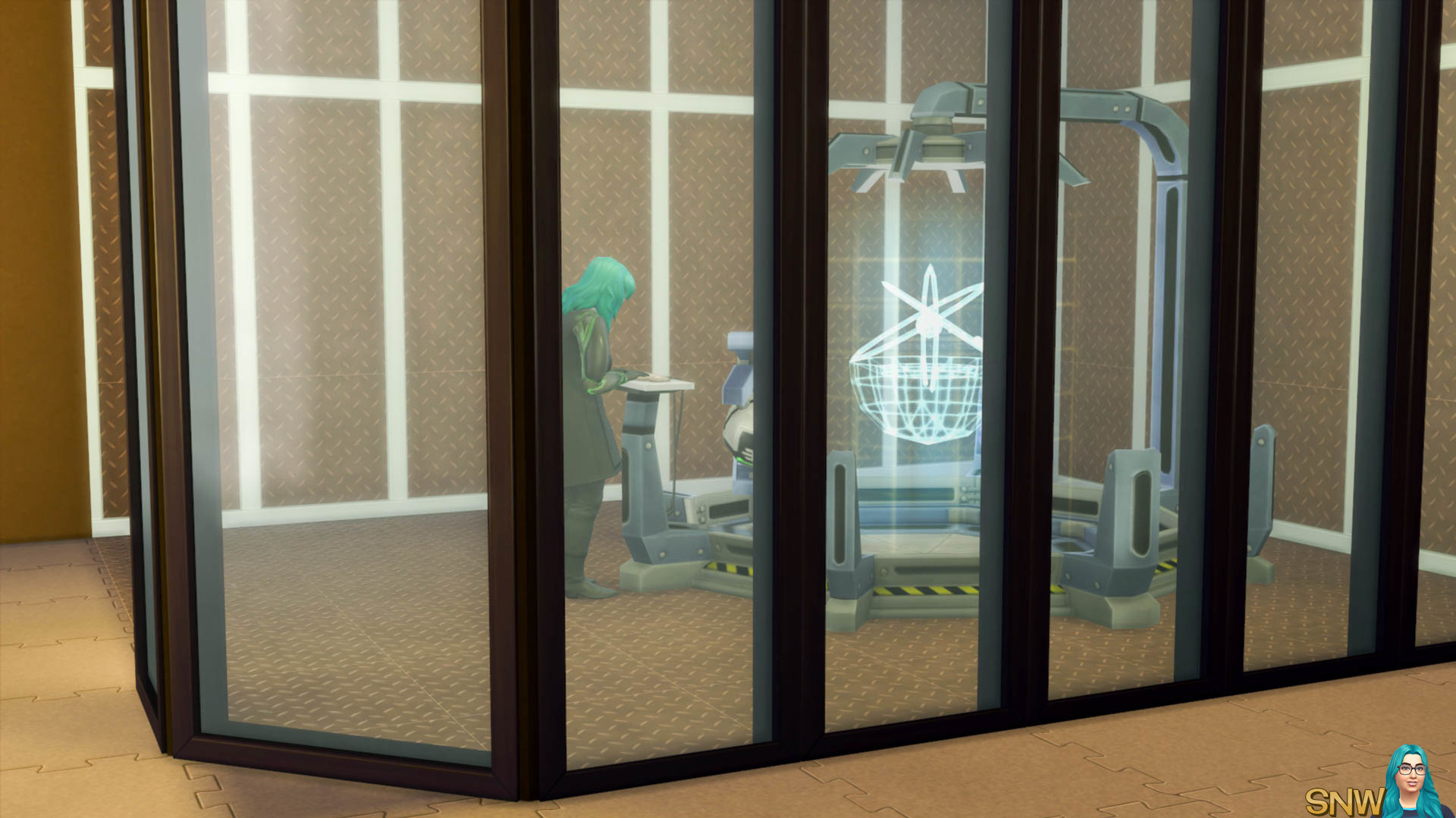 Rosie is using the previously mentioned Sim Ray on one of her colleagues, using one of the upgrades (Mind Control: Change Outfit).