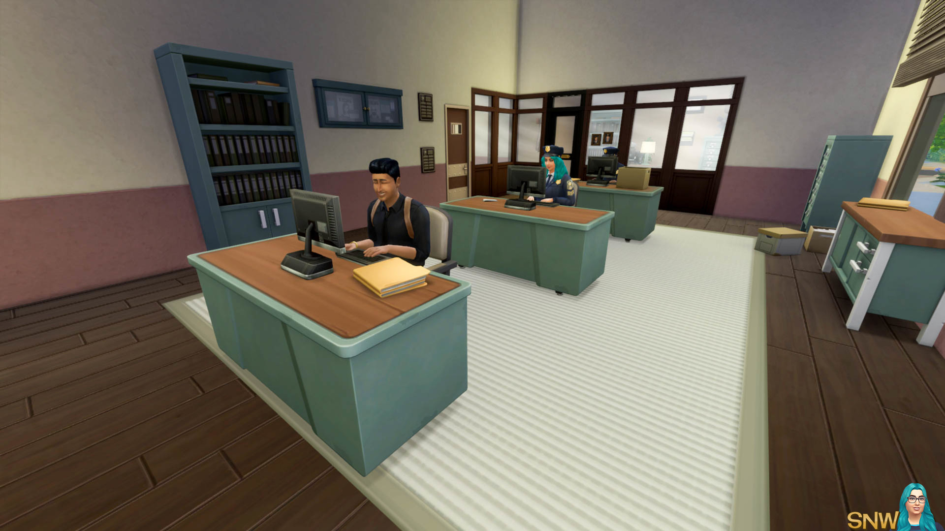 This is where it all happens. Well not everything of course. But the huge bulletin board is used for a lot of things; You can use this bulletin board to Travel to the Crime Scene, Issue an APB, Add new Clues, Go on Patrol (and there is more). The computers also have a lot of Detective specific interactions. Getting a new Case Assignment is done by using the computer. But Detective Sims can also Browse Police Database and File Paperwork, among other things. You can also use the computer to Issue an APB and to Go on Patrol. Some things can be done through a number of objects, including the computer, bulletin board, and the front desk for example.