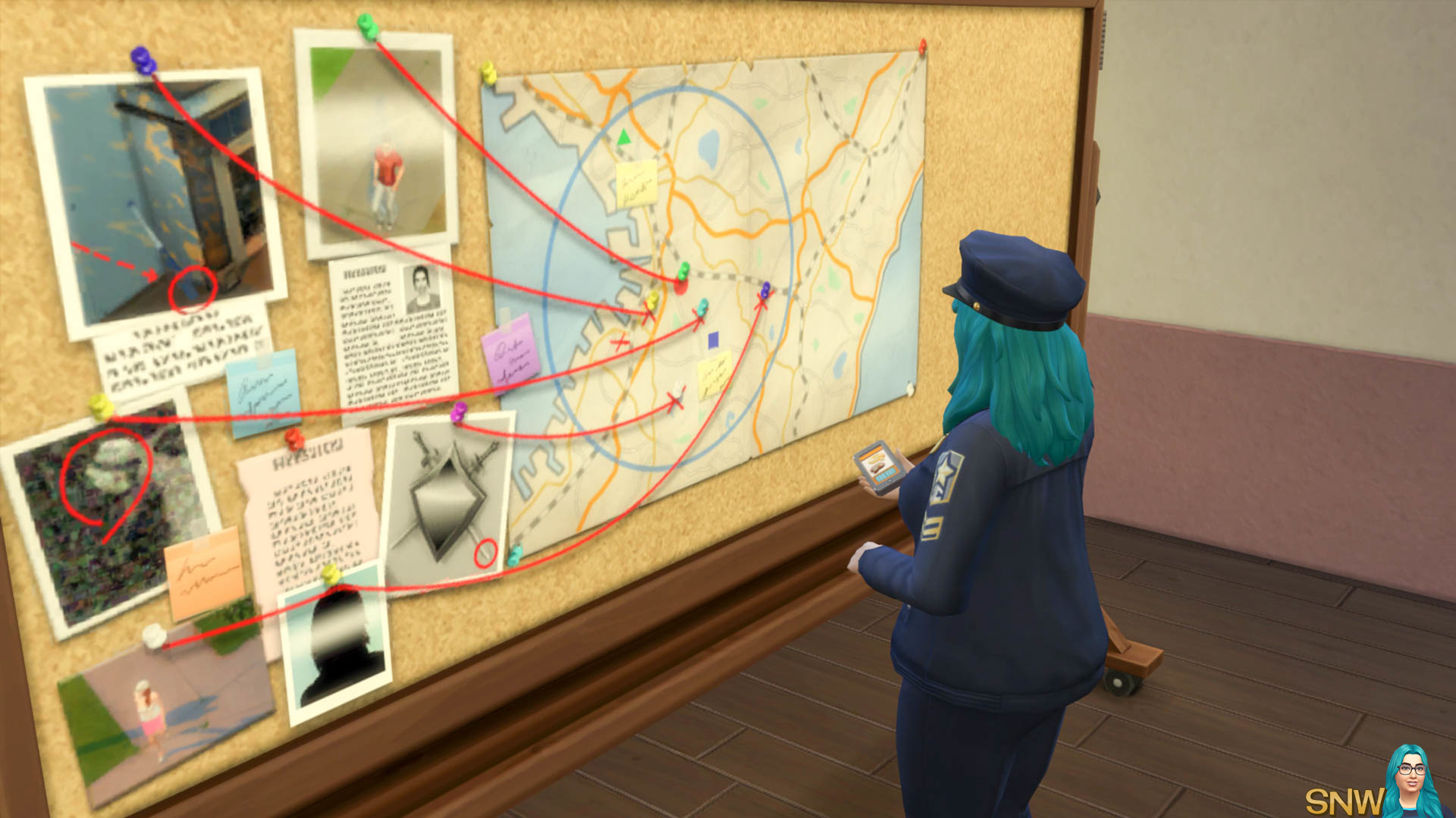 This is the bulletin board where your Sim will collect and add clues while solving a crime.